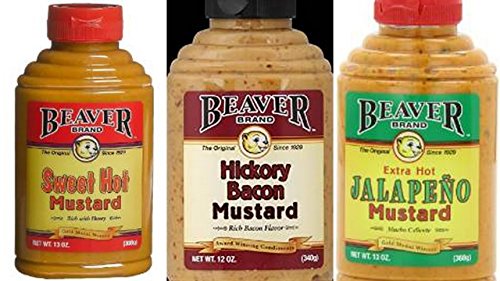 Beaver Brand Mustard Variety Bundle (Pack of 3) includes 1-Bottle Hickory Bacon, 12 oz + 1-Bottle Sweet Hot, 13 oz + 1-Bottle Extra Hot Jalapeno Mustard