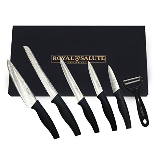 IBEET 6 in 1 Damascus Coating Stainless Steel Blades, Full Tang 5 Piece with Peeler Chef Kitchen Professional Knife Set