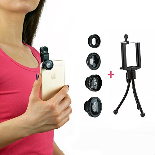 iPhone Lens 4 in 1 Magnetic Kit FishEye 180 Degree & 0.67 Wide Angle & Telephoto Zoom In 2x & Macro for iPhone 6 6+ 6S 5C/S 5 Android SmartPhones + With Free Bonus Tripod & Soft Microfiber Cloth