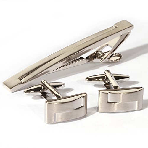 Digabi Platinum Plated Rectangular Unbalanced Glossy Cufflinks and Tie Clip Set with Nice Box