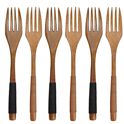Cospring Handmade Wood Forks/Spoons for Salad, Coffee, Tea, Handle with Jute string wrapped (7 inch Forks, Set of 6, Phoebe)