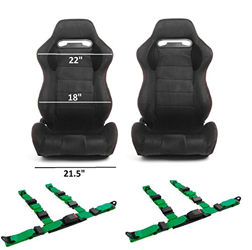PAIR OF JDM TYPE-R BLACK MICROSUEDE W/RED STITCHES UNIVERSAL RECLINABLE 578 RACING SEATS + GREEN HARNESS