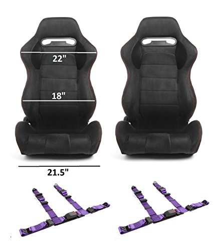PAIR OF JDM TYPE-R BLACK MICROSUEDE W/RED STITCHES UNIVERSAL RECLINABLE 578 RACING SEATS + PURPLE HARNESS