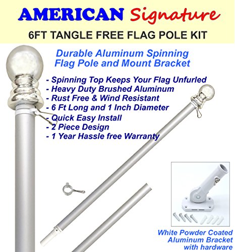 American Signature Flag Pole and Bracket Holder Kit: Includes 6 Ft Heavy Duty Aluminum Tangle Free Spinning Flagpole and Adjustable Outdoor Wall Mount Bracket (Silver, 6')