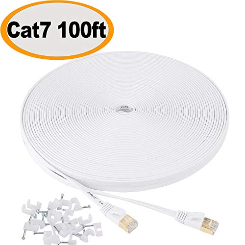 Jadaol Cat 7 Ethernet Cable 100 ft Shielded, Solid Flat Internet Network Computer patch cord, faster than Cat5e/cat6 network, Slim Long durable High Speed RJ45 Lan Wire for Router, Modem, Xbox – White