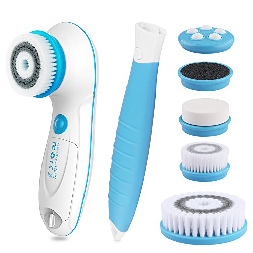 6 in 1 Waterproof Electric Facial & Body Cleansing Brush with 2 Speeds Setting for Skin Care, Include Detachable Handle & 5 Brush Head and Cute Cosmetic Bag (blue)