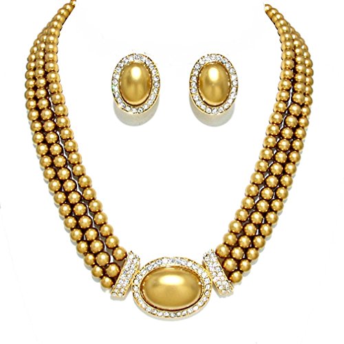 Christina Collection Elegant Multi Layered Strands Golden Brown Pearl Crystal Necklace Clip on Earrings Set Gift Bijoux