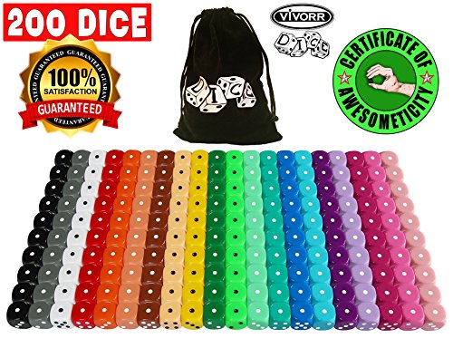 Vivorr Premium Dice Set of 200 Pieces, 20 Colors, 10 of Each Color, 16mm, D6, c/w Velvet Carry Bag / Pouch, Perfect for: Tenzi, Farkle, Yahtzee, Bunco, Board Games, Casino or Teaching Math. Ideal Gift