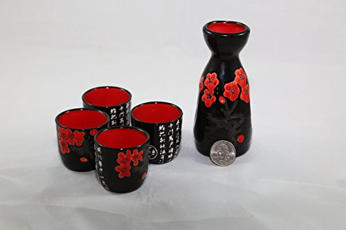 Japanese Sake Set - Gloss Black Red Plum Blossoms and White Characters - 5 Piece Ceramic Set