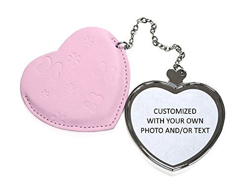 Valentine's Day Gift - Personalized with Your Own Photo And/or Text - Heart Mirror with Pink Leather Case - Includes Gift Box