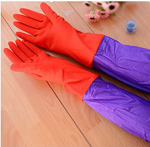 FJTANG 1 Pair Long Sleeve Thicken Velvet Waterproof Gloves Rubber Latex Kitchen Washing Dishwashing Household Laundry Housework Cleaning Warm Glove