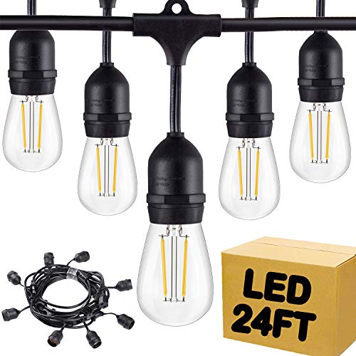 Outdoor Commercial String Lights, 24Ft Heavy Duty Weatherproof Lighting Strands,18 Gauge Black Cable with 8 Hanging Sockets, 10 LED Bulbs for Patio Garden or Party