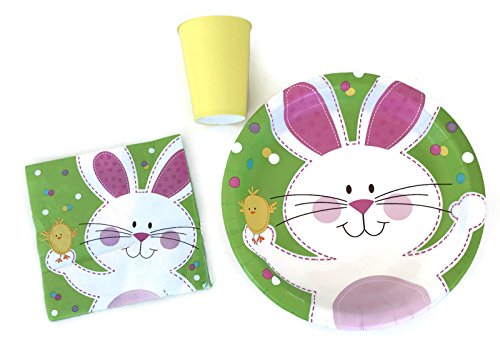 Easter Bunny and Chick disposable dinnerware - easter decoration -Bundle Kit for 16 Guests– 3 Items; Banquet Plates, Napkins and Cups.