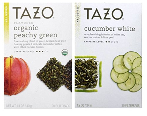 Tazo Flavored White and Green Tea 2 Flavor Variety Bundle; (1) Tazo Organic Peachy Green Tea (1) Tazo Cucumber White Tea, 1.2-1.4 Oz. Ea.