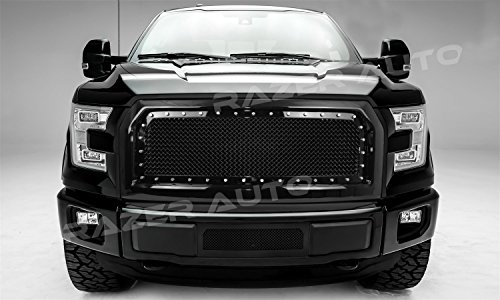 Razer Auto Gloss Black Rivet Studded Frame Mesh Grille Complete Factory Replacement Grille Shell for 15-17 2015-2017 Ford F150