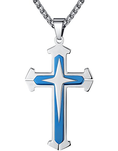 Aoiy Men's Stainless Steel Blue Layered Cross Religious Pendant Necklace, 24" Chain, ggp062ly
