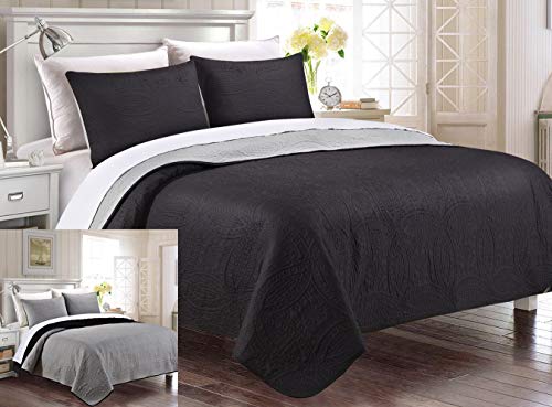 3-Piece Reversible King / Cal King Bedspread Black / Grey Coverlet Embossed Bed Cover set