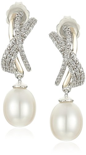 Sterling Silver and 14k Yellow Gold Freshwater Cultured Pearl and Diamond Crisscross Drop Earrings (1/5cttw, I-J Color, I2-I3 Clarity)