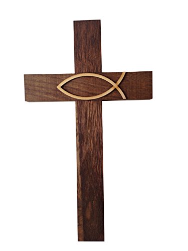 Wall Cross Wooden with Christian Fish 9" in Dark Walnut