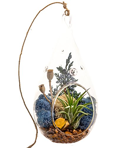 Air Plant Terrarium with 7" Teardrop Glass, Juniper Sprigs, Gold Nugget and Moss/Juniper Forest