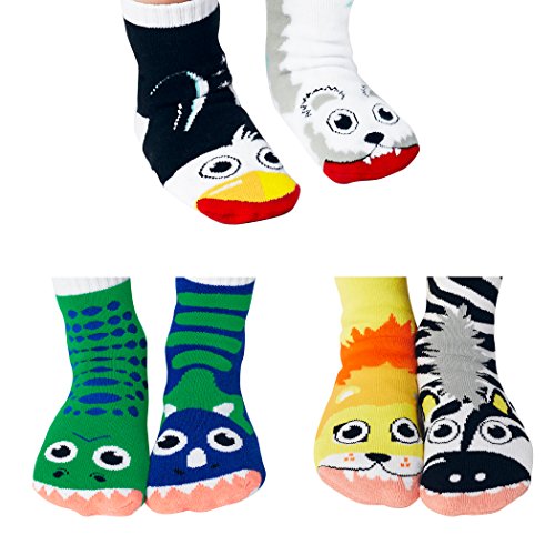 Mighty Mates | 3 Pair Mismatched Sock Gift Box (Age 1-3) | Lion/Zebra, T-Rex/Triceratops, Polar Bear/Penguin | Nonskid No Slip Grips