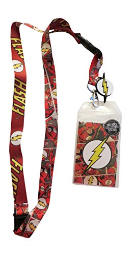 DC Comic Flash Reversible Breakaway Keychain Lanyard with ID Holder, Rubber Lightning Bolt Logo Charm and Collectible Sticker