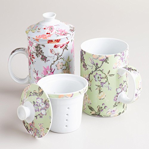 Blossoming Flowers Infuser Porcelain Teacup Mug with Lid and Filter - 12 Oz (Blue)