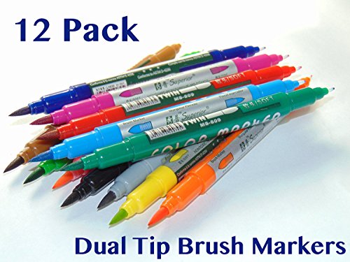 Dual Tip Brush Pen Set 12 PACK - Brush Tip & Fine Tip - Watercolor Markers, Blending, Shading, Calligraphy, Drawing, Vibrant Colors Great For Adult Coloring