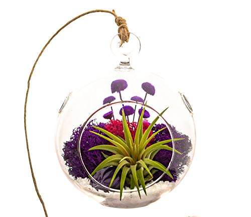 Bliss Gardens Air Plant Terrarium with 4" Round Glass / Moss / Flowers and Agate / Purple Passion