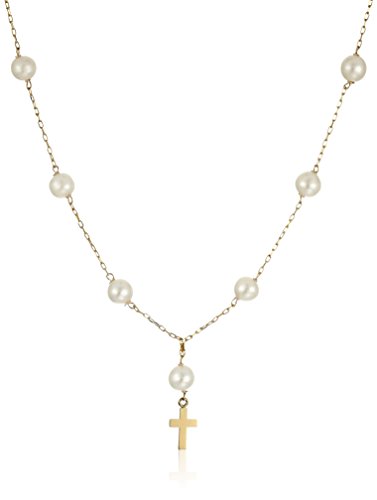 Girls' Freshwater Cultured Pearl and Cross Charm 14k Yellow Gold Tin Cup Necklace Pearl Strands, 14"