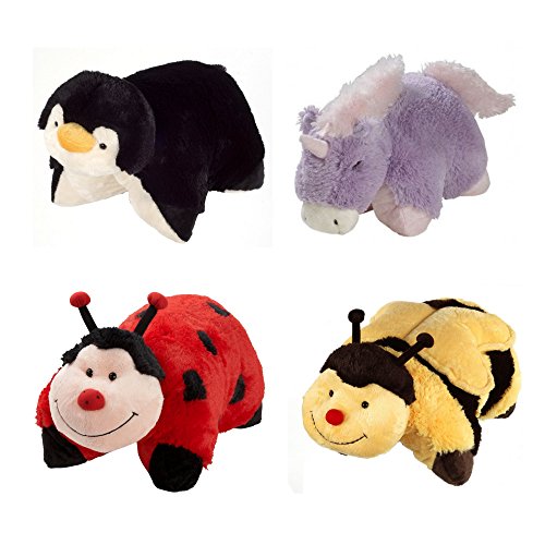 Pillow Pet Peewee 4-pack Super Bundle-Playful Penguin, Ms. Ladybug, Buzzy Bumblebee, Lavender Unicorn (All 11-inches)