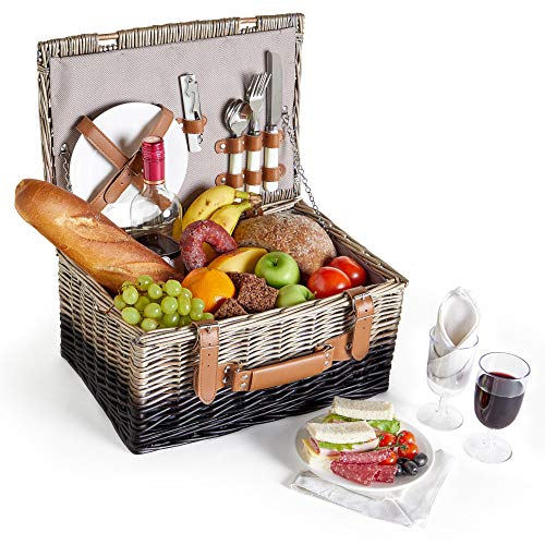 VonShef Deluxe 2 Person Traditional Wicker Picnic Basket Hamper with Cutlery, Plates, Glasses, Tableware & Fleece Blanket