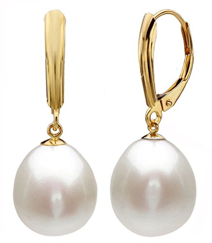 14k Gold Drop Pearl Earrings with Freshwater Cultured Pearls (Leverback Pearl Earrings, Pearls Available in 8-8.5 mm and 10-10.5 mm Sizes, Gift Box Included with Earrings)