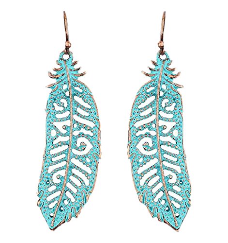 Lovely Turquoise Blue Metal Filigree Feather Hook Earrings