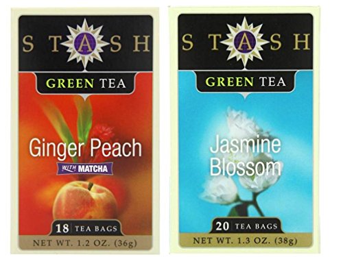 Stash Flavored Green Teas 2 Flavor Variety Bundle: (1) Stash Ginger Peach Green Tea with Matcha, and (1) Stash Jasmine Blossom GreenTea 1.2-1.3 Oz. Ea. (2 Boxes)