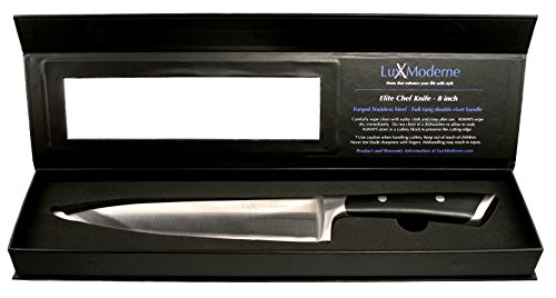 Lux Moderne Elite Chef Knife - 8 inch Forged Stainless Steel Full Tang blade with double rivet handle in elegant black Gift Box.