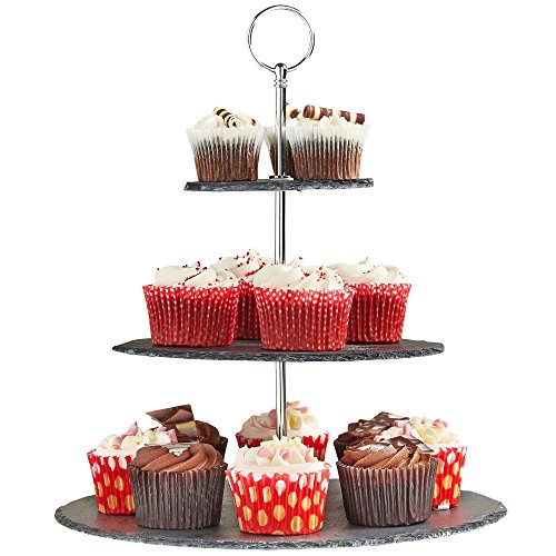 VonShef 3 Tier Natural Slate Serving/Cake Stand with Silver Carry Handle - Great For Use At Parties To Hold Cupcakes, Cakes, Cookies, Tapas or Cheese - Perfect For Displaying Halloween Treats