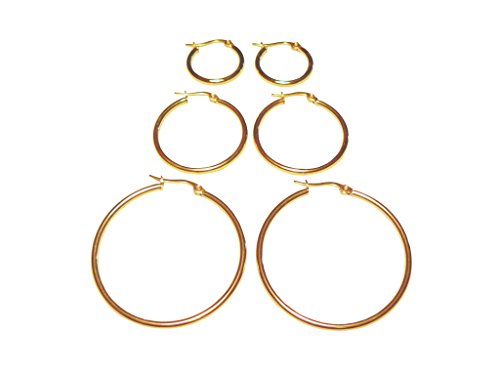 3 Pair Gold-Tone Stainless Steel Pierced Hoop Earrings, PVD, 15mm, 25mm & 40mm Diameters