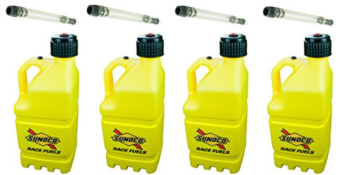 4 Pack Sunoco 5 Gallon Yellow Race Utility Jugs and 4 Deluxe Filler Hoses