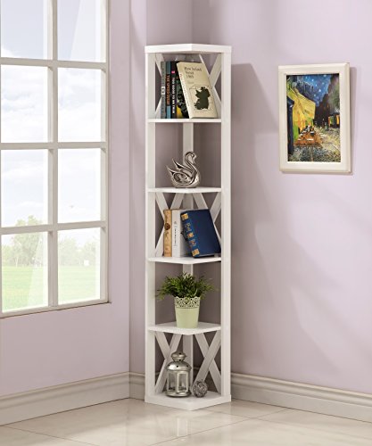 White Finish X-Design Wood Wall Corner 5-Tier Bookshelf Bookcase