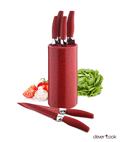 Clever Cook 7 Piece Chef Knife Set Non-Stick Marble Finish with Universal Knife Block (Red)