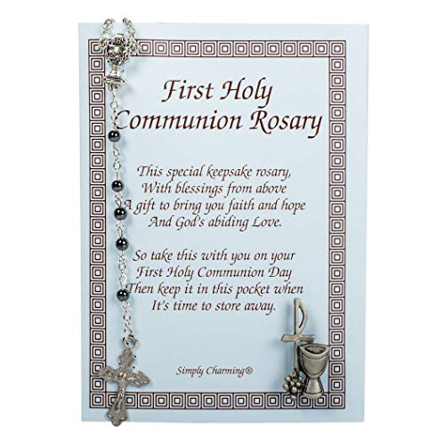 First Holy Communion Boys White Tie, Chalice Cross Pin and Hematite Rosary Gift Set