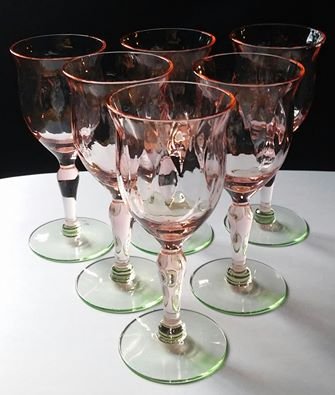 Tiffin Pink Depression Green Foot Watermelon Glass Cordial or Sherry Stem Lot X 6 Diamond Optic
