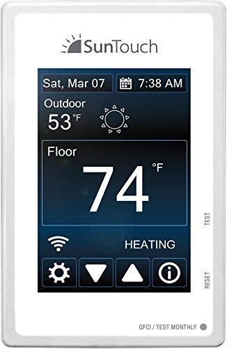 SunTouch Connect WiFi enabled Touchscreen Programmable Thermostat [universal] Model 500875 (low-profile floor heat control, 120/240V, bright white + paintable beauty ring) includes floor sensor