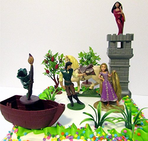 Tangled Birthday Cake Topper Set Featuring Pascal, Rapunzel, Mother Gothel, Flynn Rider, Maximus and Other Themed Decorative Accessories