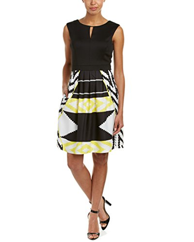 ELLEN TRACY Women's Cap Sleeve Solid Top with Key Hole and Printed Fit and Flare Skirt, Black/White/Yellow, 8