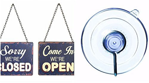 Vintage Open and Closed Sign - 2 Sided 16” High - Tin - Blue with Adams Suction Cup Hook (Medium) : Bundle