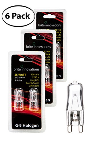 Brite Innovations G9 Halogen Bulb, 25 Watt – 6 Pack – Energy Saving - Dimmable - Soft White 2700K - 120V - Q40, CL, T4 JD Type, Clear Light Bulb