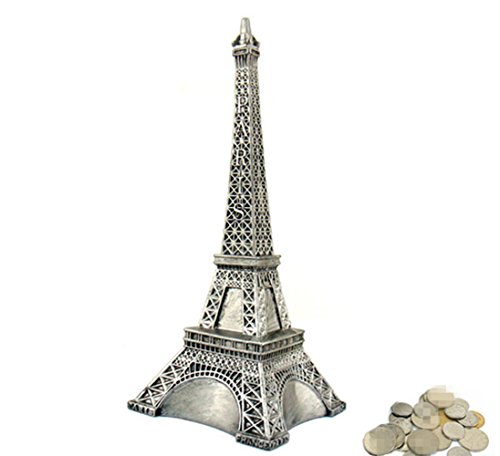 Vintage Poly-resin Eiffel Tower Piggy Money Coin Saving Bank for Valentines Day Gift, Home Office Bar Display (Silver)
