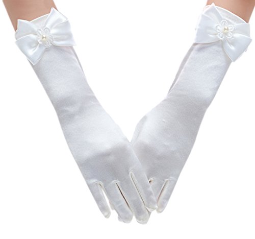 Biwinky Girl's Stretch Satin Long Finger Dress Gloves Girl Children Party (L, White)
